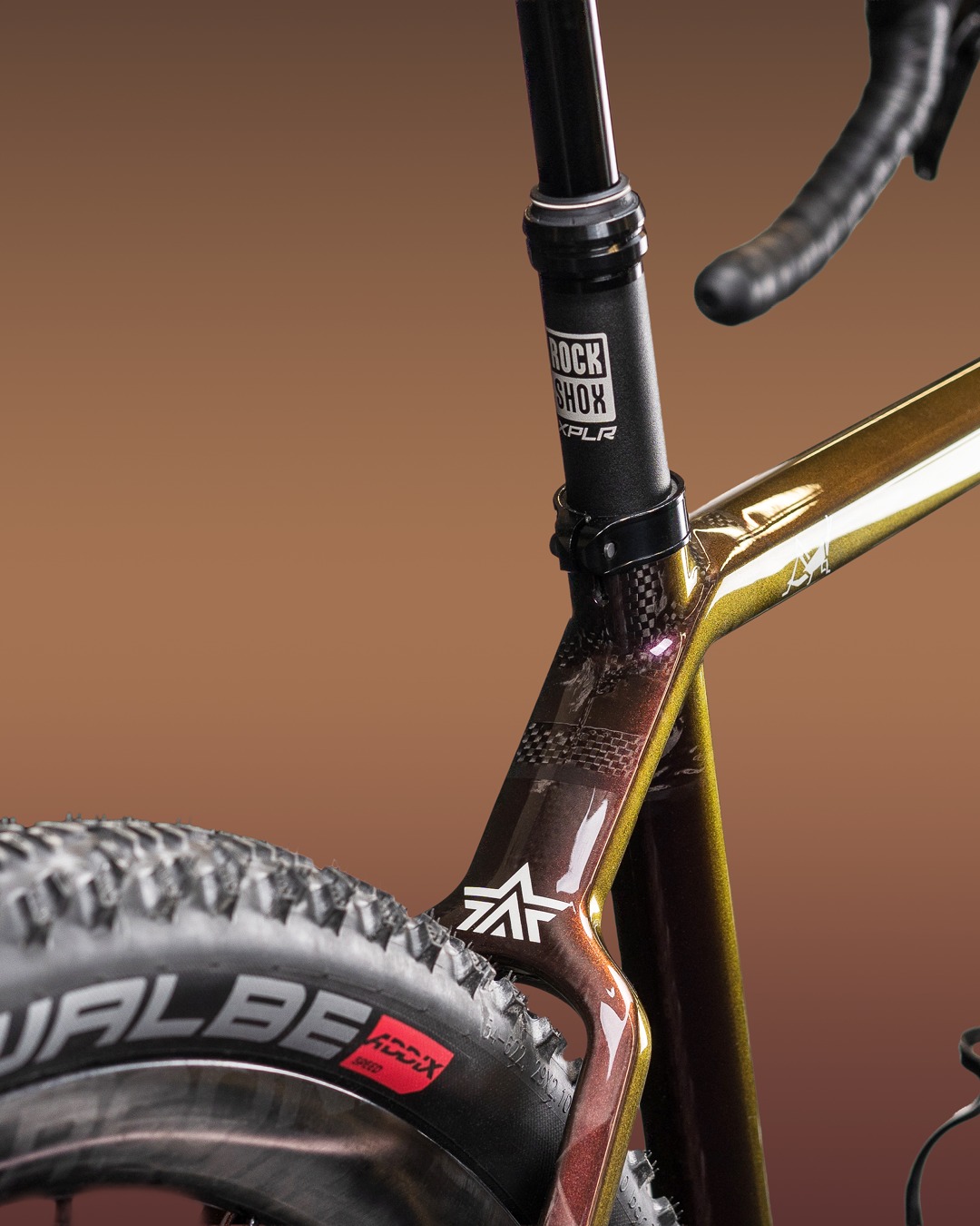 The one they built for one of their clients last week is a great example of a complete Supernaut GR3 build. Gold coloured fading to magenta. With pearl white logos. A machine built to climb loose fire roads, and descend with intent. Everything what gravel riding is all about.