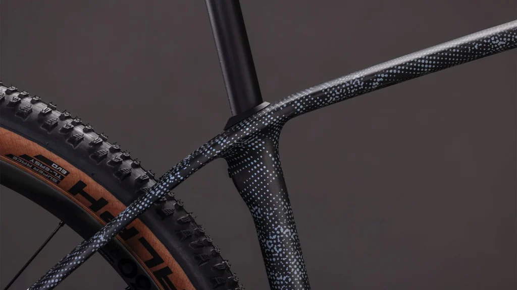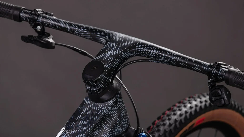 Cube managed to produce a mountain bike frame weighing less than 900 grams. No wonder that the new Phenix C:68X SLT is just 8.7 kg. With a staggering and very distinctive paint design. Cube calls it matrix black and white. And it covers the cockpit as well.