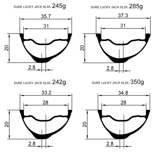 Finally, the 350 g version is only available in 28 mm width for rear mounting and a “very committed” XC use as Duke explains. The specs of the different rim weights are shown in the image below.