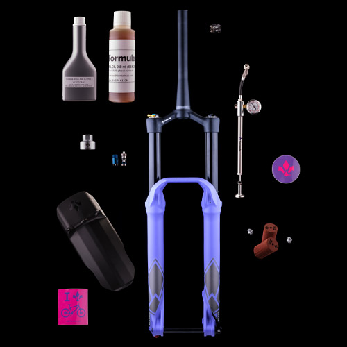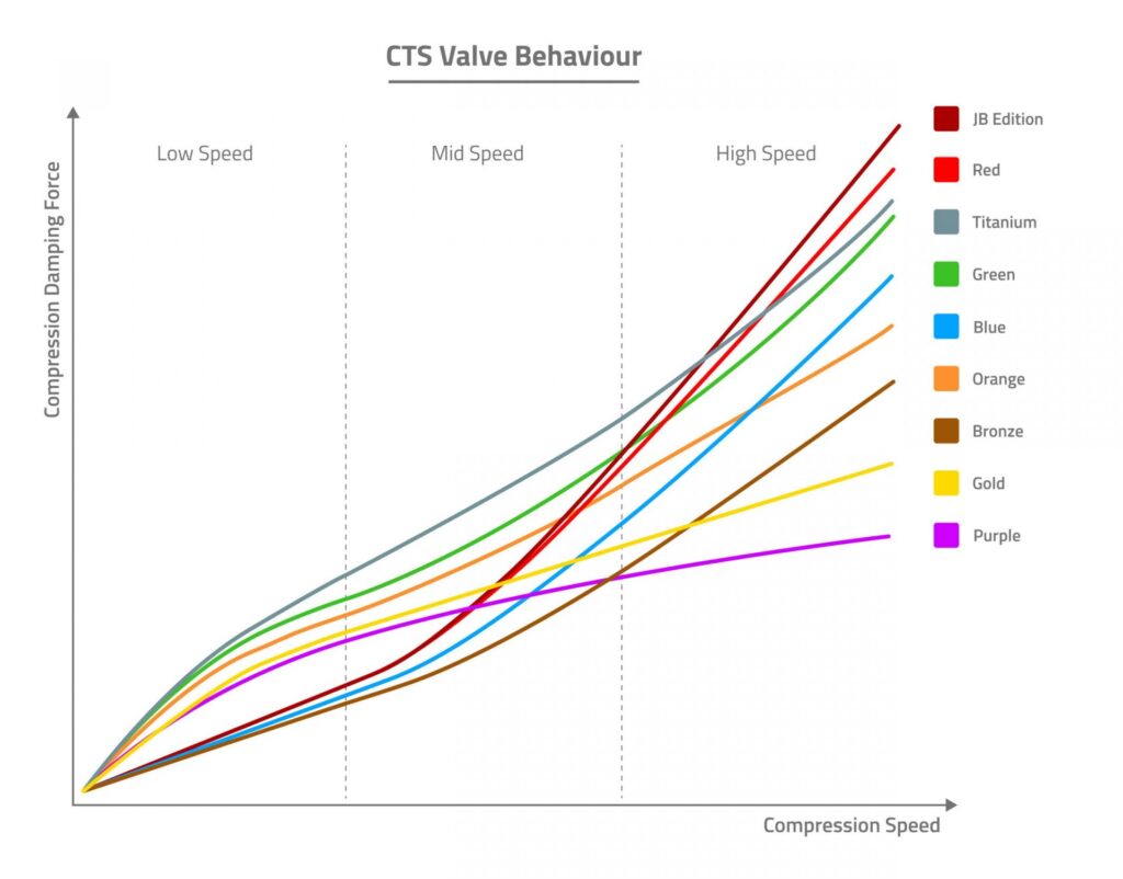 Adjustments: rebound 19 clicks, compression high/low 12 clicks, blue and gold valves included