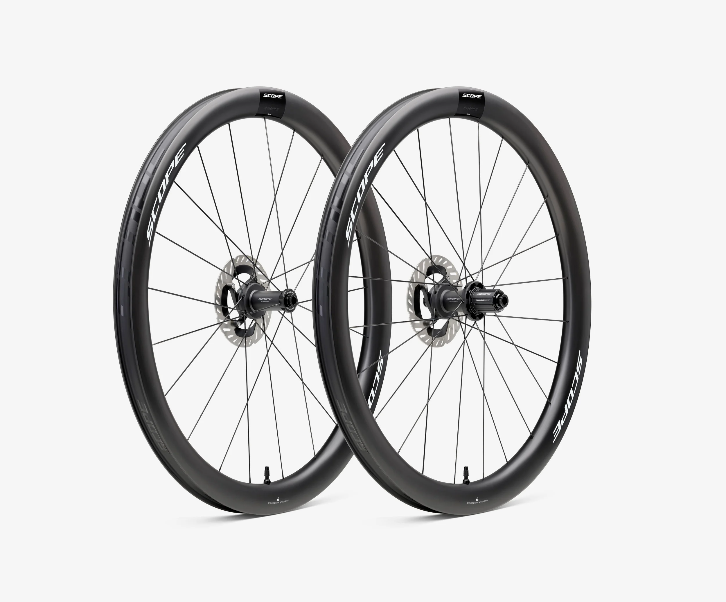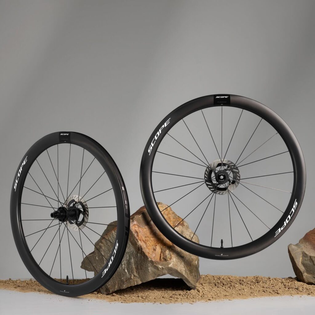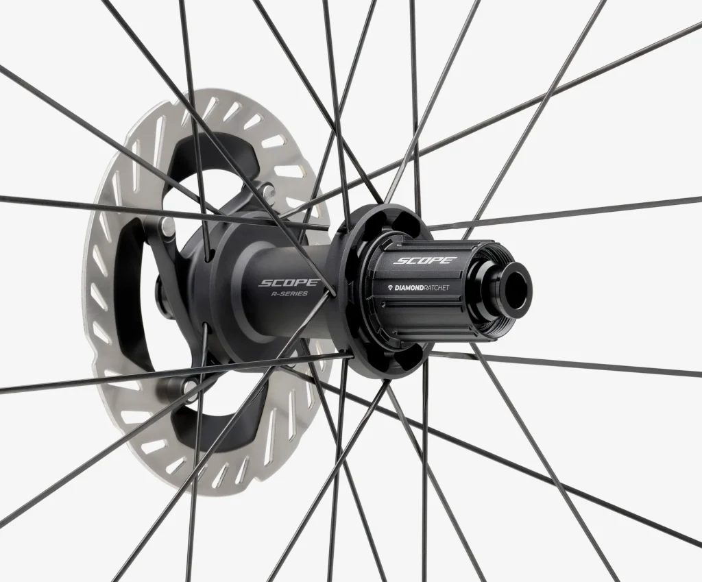 Hubs: Scope R-series, bearing 2x 61803 SKF (front), 3x 61803, 1x 61903 SKF (rear), engagement 36T Diamond Ratchet SL, width 12×100/142, centerlock.