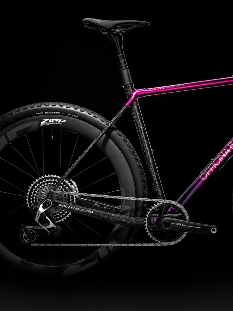 The shimmering pink, purple colour of the Cortina gravel bike by Officina Battaglin is named after the natural phenomenon “enrosadira”. You can see it twice a day in the Cortina d’Ampezzo area in the Italian Dolomites. It is a fascinating sight, both in the mountains and to see it reflected in this bike.