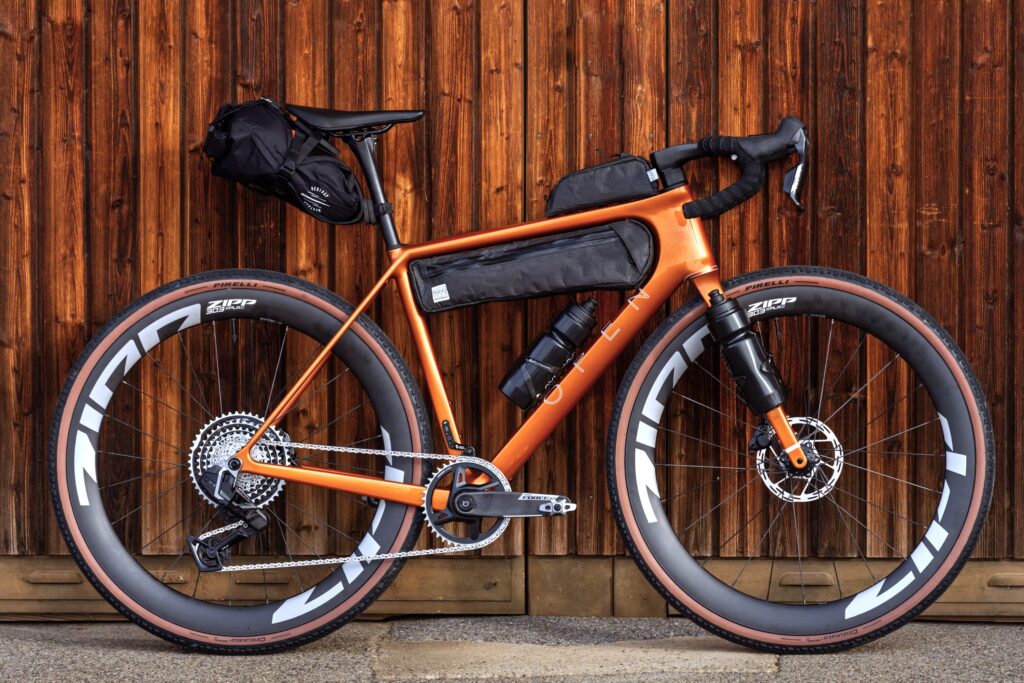All OPEN U.P. 2.0. and U.P.PER 2.0. frames can take a top tube bag and under-the-BB storage. The U.P. 2.0 & U.P. 2.0 Adventure have 3 extra rivnuts under the top tube for strapless frame bags. And as mentioned, the Adventure bike comes with the cargo fork as well.