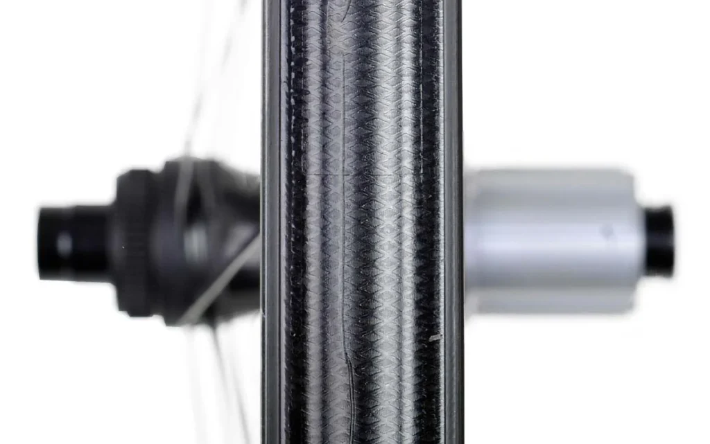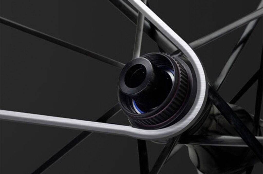 Spokes contain 108,000 continuous filaments (carbon threads) carrying the tension as it exits the rim, wraps around the hub and terminates back at the rim, maintaining load throughout and minimizing stress at the spoke to hub junction. This construction allows the use of only 10 (long) spokes for 20 rim holes, eliminating slack and optimizing stiffness.