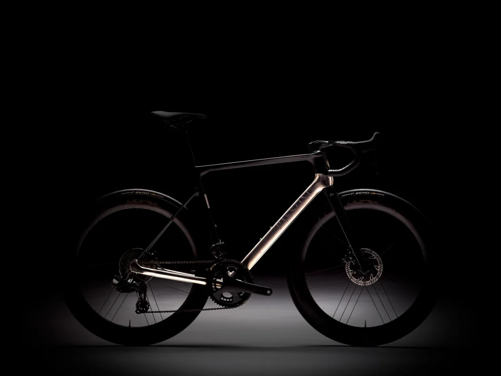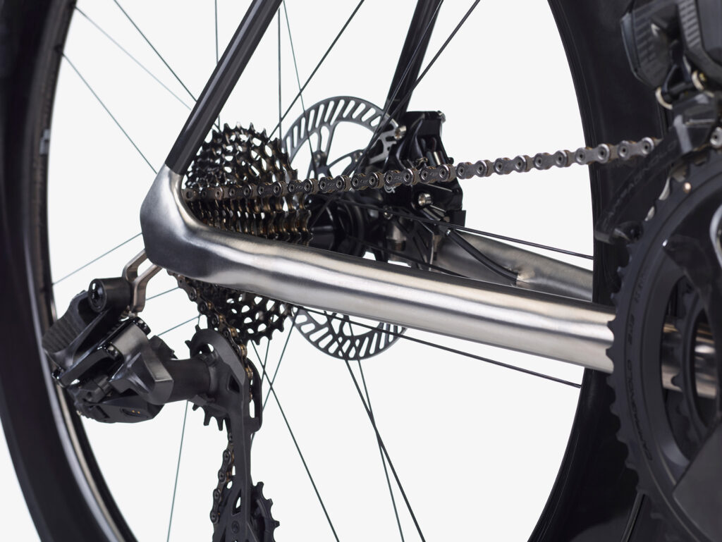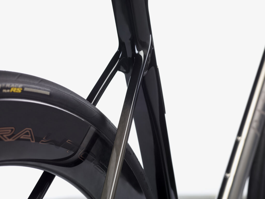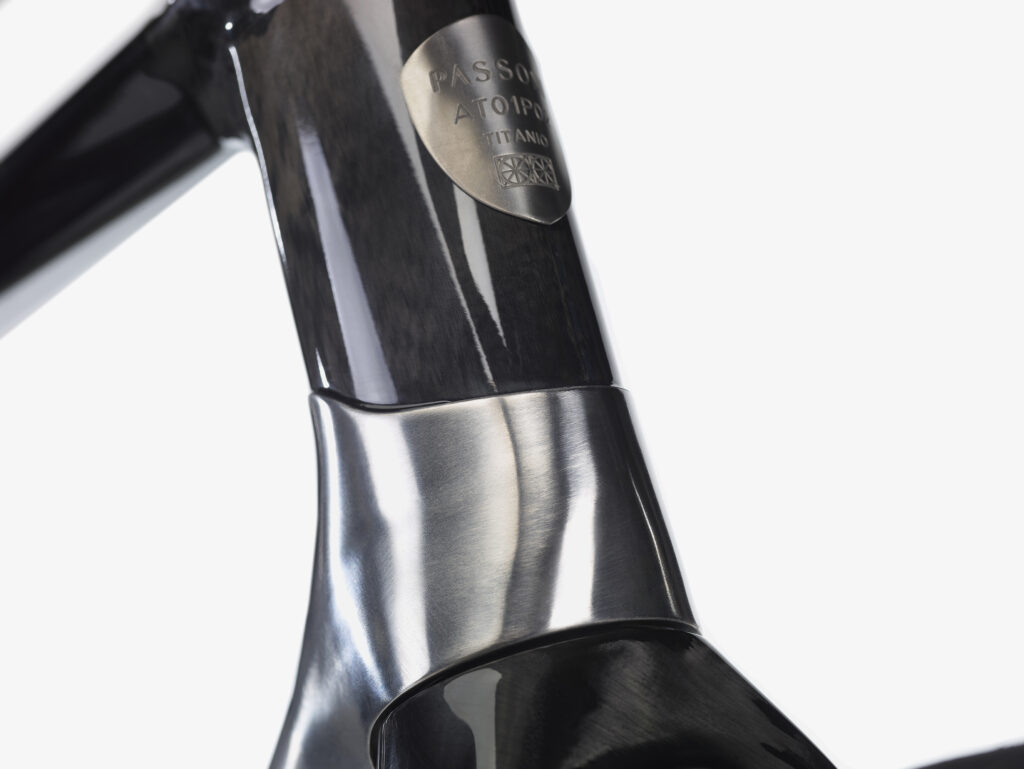 Frame: front triangle titanium tube downtube Ø 44mm aero-shaped, rear triangle titanium tubes chainstays Ø 25.4 mm, aero-shaped 30 x 21mm, bottom bracket shell titanium grade 9 CNC machined (Passoni engraved logo and frame code, T47), head tube titanium grade 5, 3D printed and CNC machined, bearings Ø 1”1/2, dropouts titanium grade 5, 3D print and CNC machined, for disc brake thru-axle, high modulus monocoque carbon aero-shaped frame (handmade in Italy)