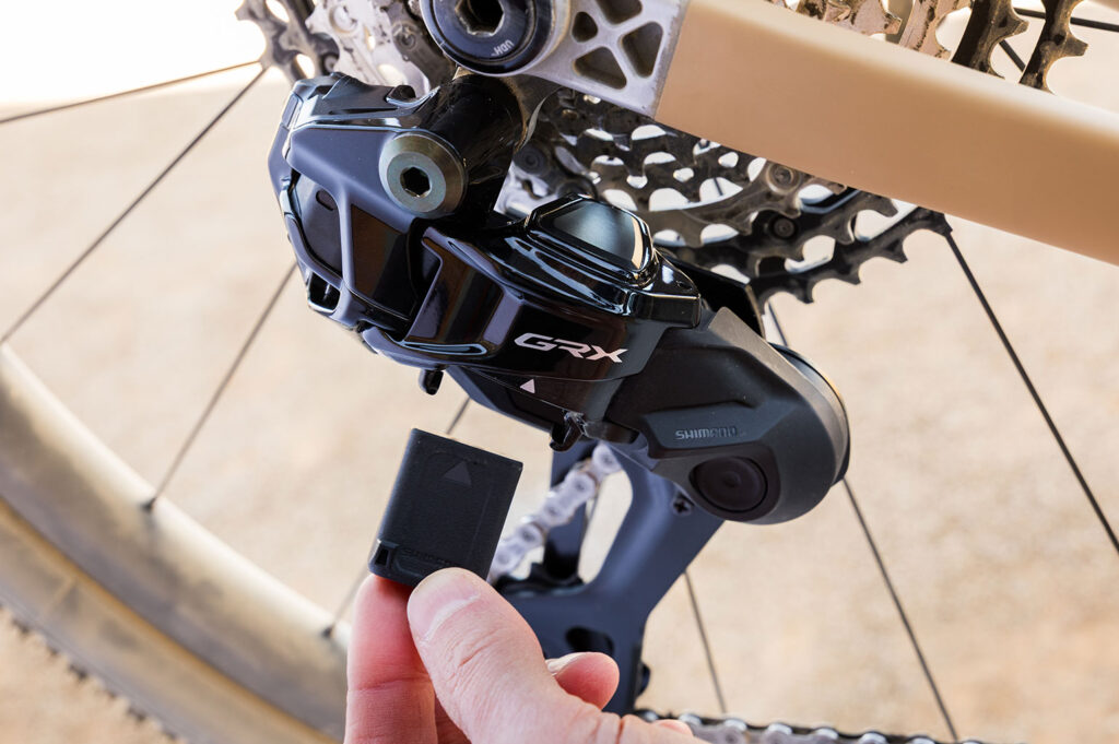 The derailleur has an automatic ‘impact recovery’ that disconnects in case of major blows. According to Shimano the battery lasts about 700-1.000 km. After that, you need to remove it to recharge. The derailleur can be connected to the Shimano app via bluetooth.