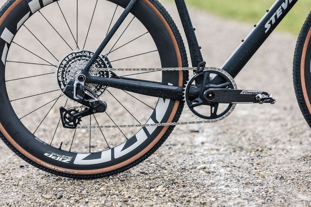 The Camino RS Pro AXS is the race flagship in the gravel bike range of Stevens. And being multiple times WC in cyclocross, the brand knows how to handle rough terrain competitively. The Camino RS AXS underlines that statement, being light, robust and race-ready. With a light carbon SL fiber frame, ZIPP wheels and the Force XPLR 1×13 wireless drivetrain, the scale indicates just 7,9 kg. Impressive for a gravel bike, especially in this price range. Keeping in mind there is still room for even more weight tuning.