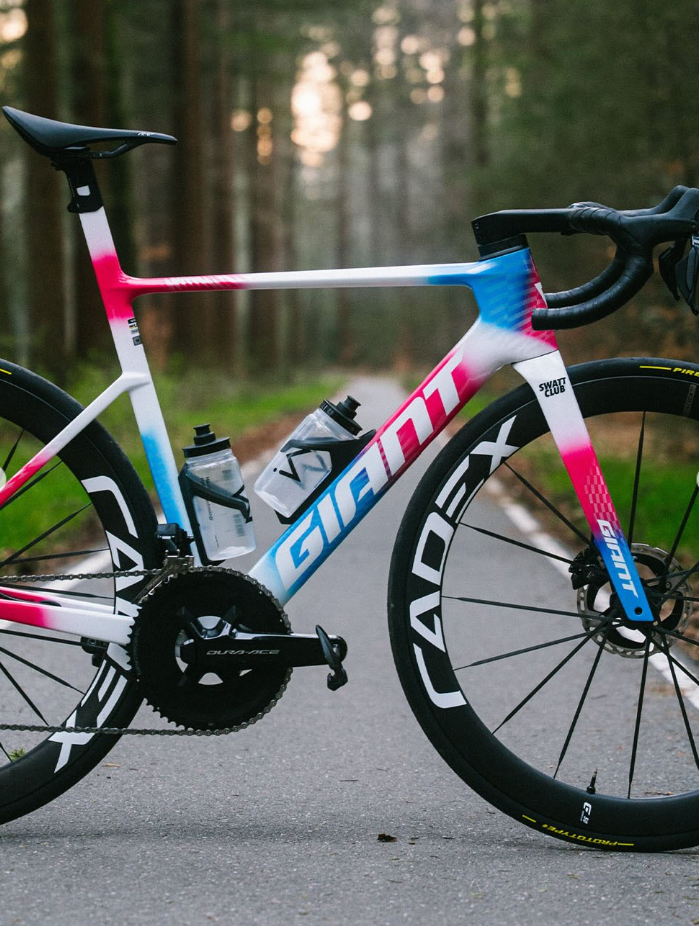 The new team bike of the Swatt Club UCI Continental Team looks like a tribute to Piet Mondriaan being a composition in red, blue and white. This is a design you won´t miss easily in the peloton.