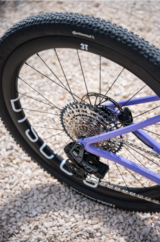 The frameset comes with the Fango rigid fork, More² stem and Superghiaia Integrale LTD handlebar. Complete bikes are available with Shimano GRX 1×12 mechanical or Di2 groupsets, as well as SRAM Rival / GX Eagle AXS options, with a choice between alloy wheels or carbon Discus 45|40 wheels, either with rigid or suspension fork. The bike comes in four different colours: beige, green, purple or grey.