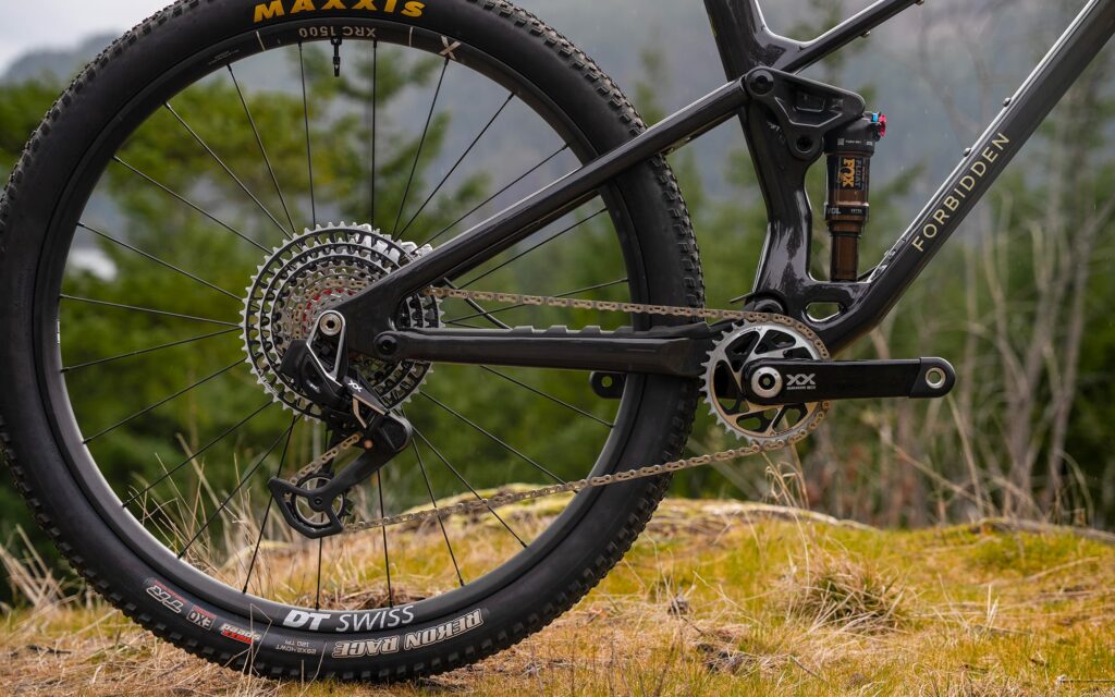 Forbidden also decided against in-frame storage for weight savings and maintaining chassis stiffness. There is room for one full-size water bottle, and an accessory mount is found under the top tube. The carbon frame comes at a weight of 2,27 kg (without shock).