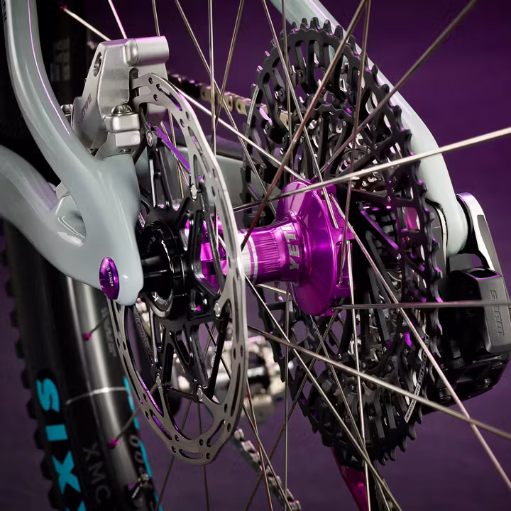 The violet and turquoise colours of this Yeti A.S.R. bring you back to the 80’s of Miami Vice. However, technically the bike is very up to date. With DT Swiss hubs, Chris King components, SRAM drive train, ODI grips in violet and FOX suspension and Maxxis tyres in turquoise, this bike is ready to rock in 2026.